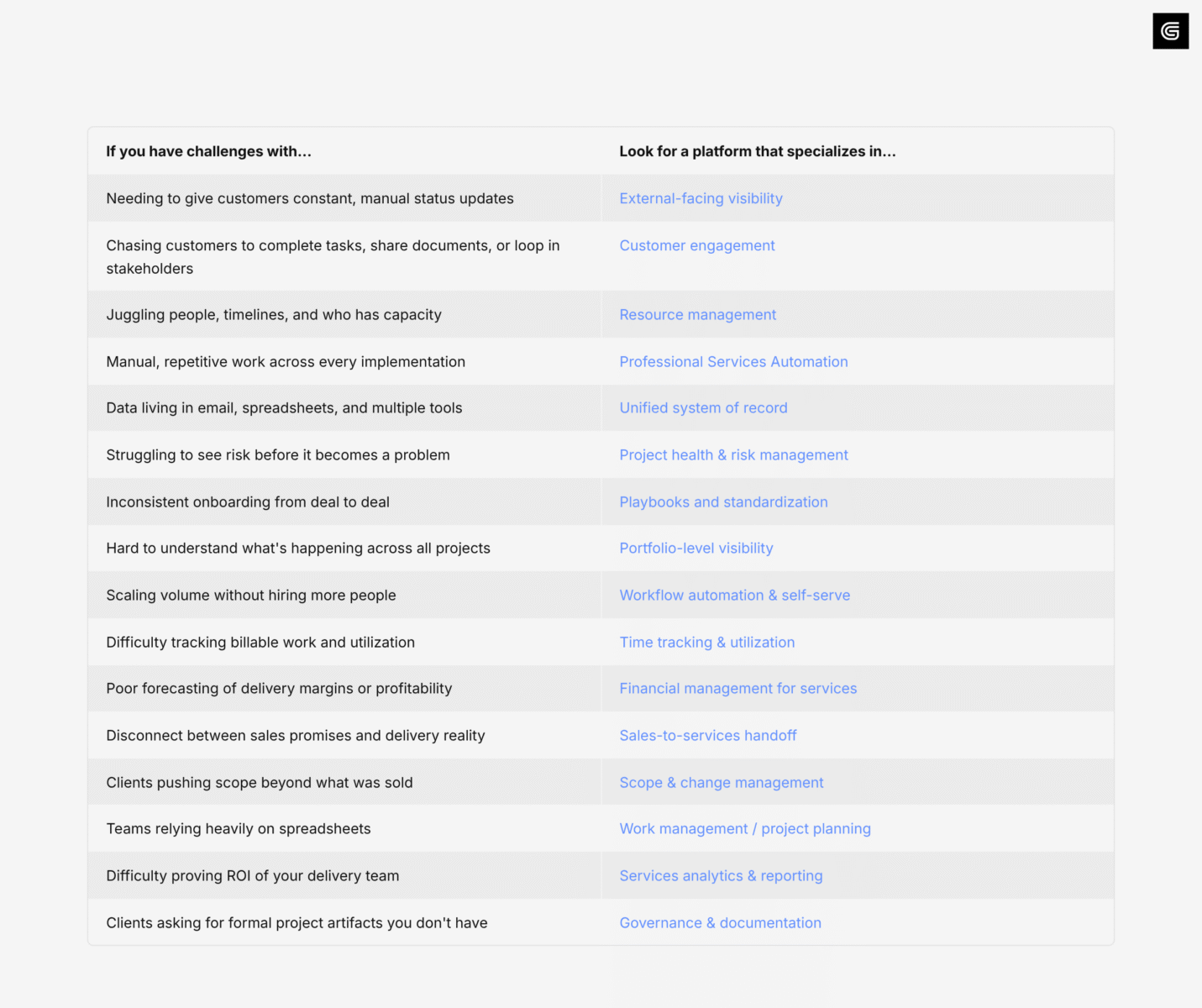 | Services operations orientation for services orgs | More “services ops” than “customer onboarding experience” in its core design |
