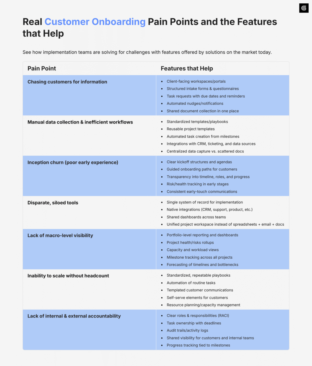 Implementation teams across B2B SaaS are realizing in 2026 that spreadsheets, generic project management software, and email threads can no longer support engaging, transparent customer experiences—particularly when they have a high volume of onboarding projects. They’re now turning to platforms purpose-built for it.